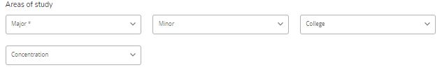 The next section is labeled "Areas of Study." Choose the Major, Minor, College, and/or Concentration that you are considering. In order to accurately represent the degree requirements for the selected program of study, the Major and the College sections should be selected.