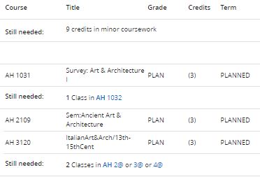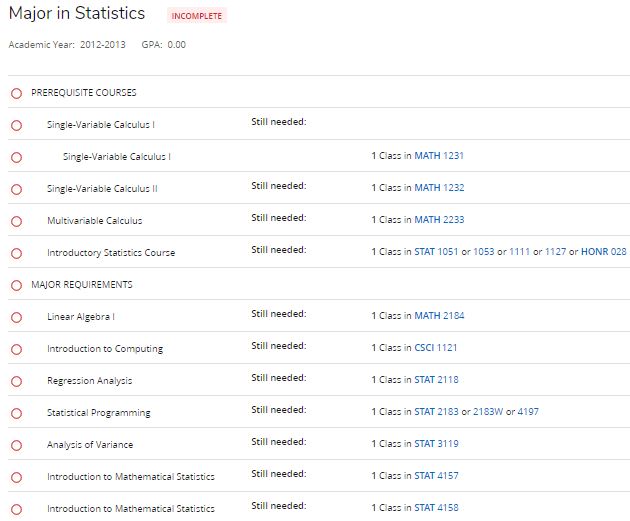 The following is how the What-If screen would look to display the requirements for a Bachelor of Science in Statistics and a Minor in Art History with an Academic Year of 2012-2013, with planned courses of AH 1031, 2109, & 3120.