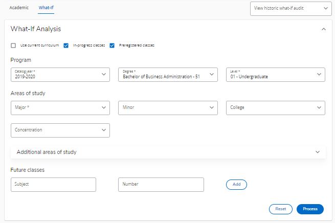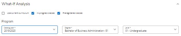 The first section is labeled "What-If." Underneath this are checkboxes that you can select to either use current curriculum, in-progress classes and/or preregistered courses in your processed analysis. This section also includes the Catalog Year, Degree, and Level and these fields default to the Catalog Year, Degree, and Level that you are currently pursuing. The sample student is an Undergraduate pursuing a Bachelor of Business Administration degree with an Academic Year of 2019-2020