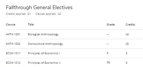 Courses that do not apply to the requirements chosen in the What-If go into Fallthrough Courses section. Classes that apply to the student’s current degree and not to the What-If requirements will go into Fallthrough Courses, but are still applying to the credit total and GPA.
